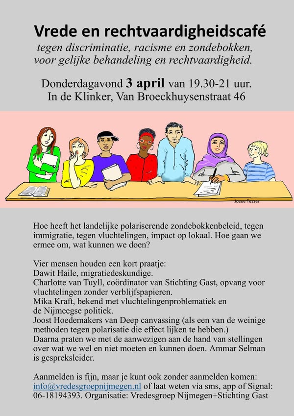 Op donderdag 3 april is er een vredescafe in De Klinker met diverse sprekers. Aanvang 19.30u